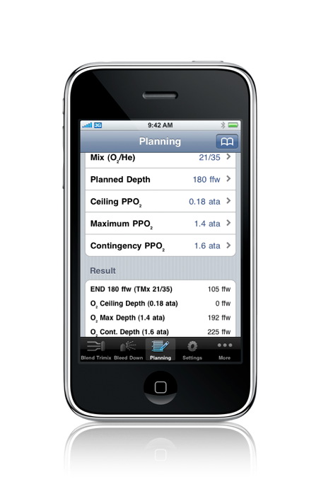 You can easily make the calculations for salt water or fresh water and in Metric or Imperial/US by selecting the “Settings” tab (if it is not visible on the current screen select “More”) and changing the appropriate settings. You can also adjust some of the warnings offered by the application in the settings tab. The next version of the software will also provide a setting for treating oxygen as a narcotic gas.