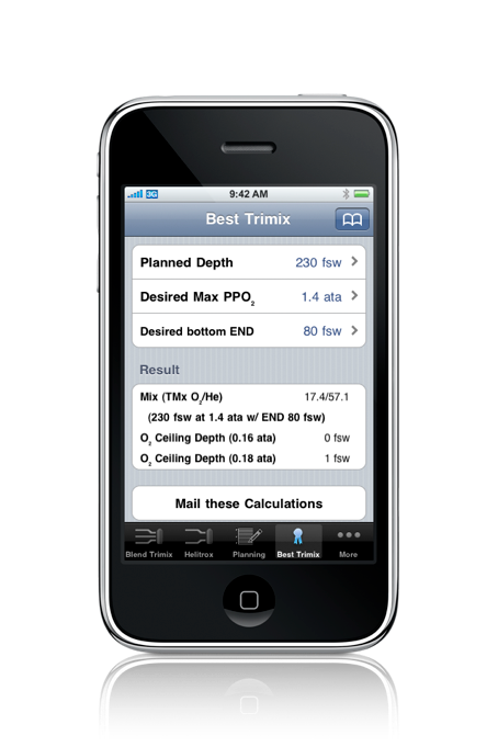 You can easily exchange the results of your dive planning or blending calculations with your dive buddies or your dive shop. Use the “Mail these Calculations” button located right below the Results panel on each of the tool tabs. Tapping this button will format your calculations into an e-mail message and compose a message right in Trimix Tools (if you are running an iPhone OS version prior to 3.0 the built in Mail application will open) so that you can address it, add your own comments and send it along.