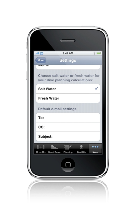 Do you find that you regularly send to the same people or want your own subject on each of the messages you send without re-entering them each time Mail opens? Just go to the “Settings” tab (by default you’ll find Settings under the “More” tab) and enter your defaults for any of the To, CC and Subject fields. Trimix Tools will use those settings to pre-populate Mail each time your tap the “Mail these Calculations” button. Of course, you can always edit the fields once you are in Mail.