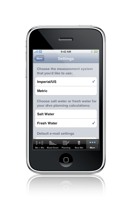 Diving in a lake or river? Need dive planning calculations in feet or meters of fresh water? Select the “Settings” tab (by default it is under the “More” tab) and choose the type of water appropriate for your diving conditions. You can switch at any time and your existing entries will be recalculated for the appropriate type of water.