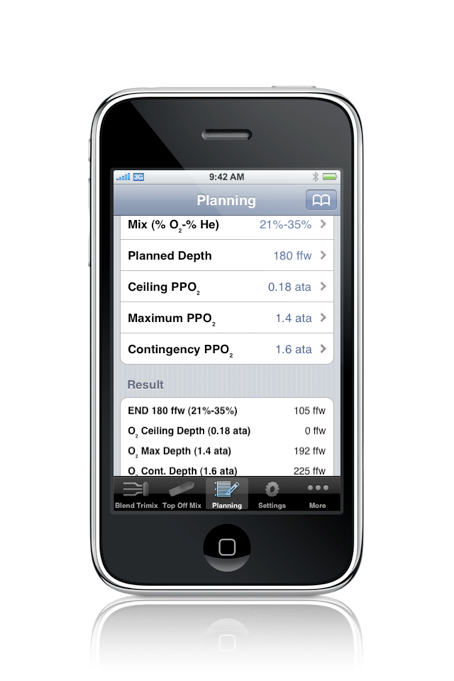 The default is to perform calculations for salt water (where one atmosphere of pressure occurs at 33’ or 10 meters). You can change this setting to fresh water (where one atmosphere of pressure occurs at 34’ or 10.3 meters). The setting will persist the next time you open the application. Units will be displayed as “fsw/msw” or “ffw/mfw” in the Planning and Best Mix tools. Make sure that the intended units are displayed before using the resulting calculations.